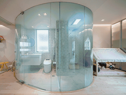 考慮到主衛生間的窗戶,是整個房子西面唯一的自然采光,設計師把通電霧化玻璃作為主衛生間的墻體材料。從外觀上看,整個主衛生間充滿了現代感和科技感,從實用角度來看,衛生間白天無人使用時可以保證房間的通亮,洗澡時則可以保證住戶的隱私。