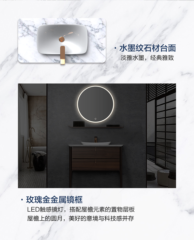 - 玫瑰金金屬邊緣 + LED觸感鏡燈,創新設計與科技感并存