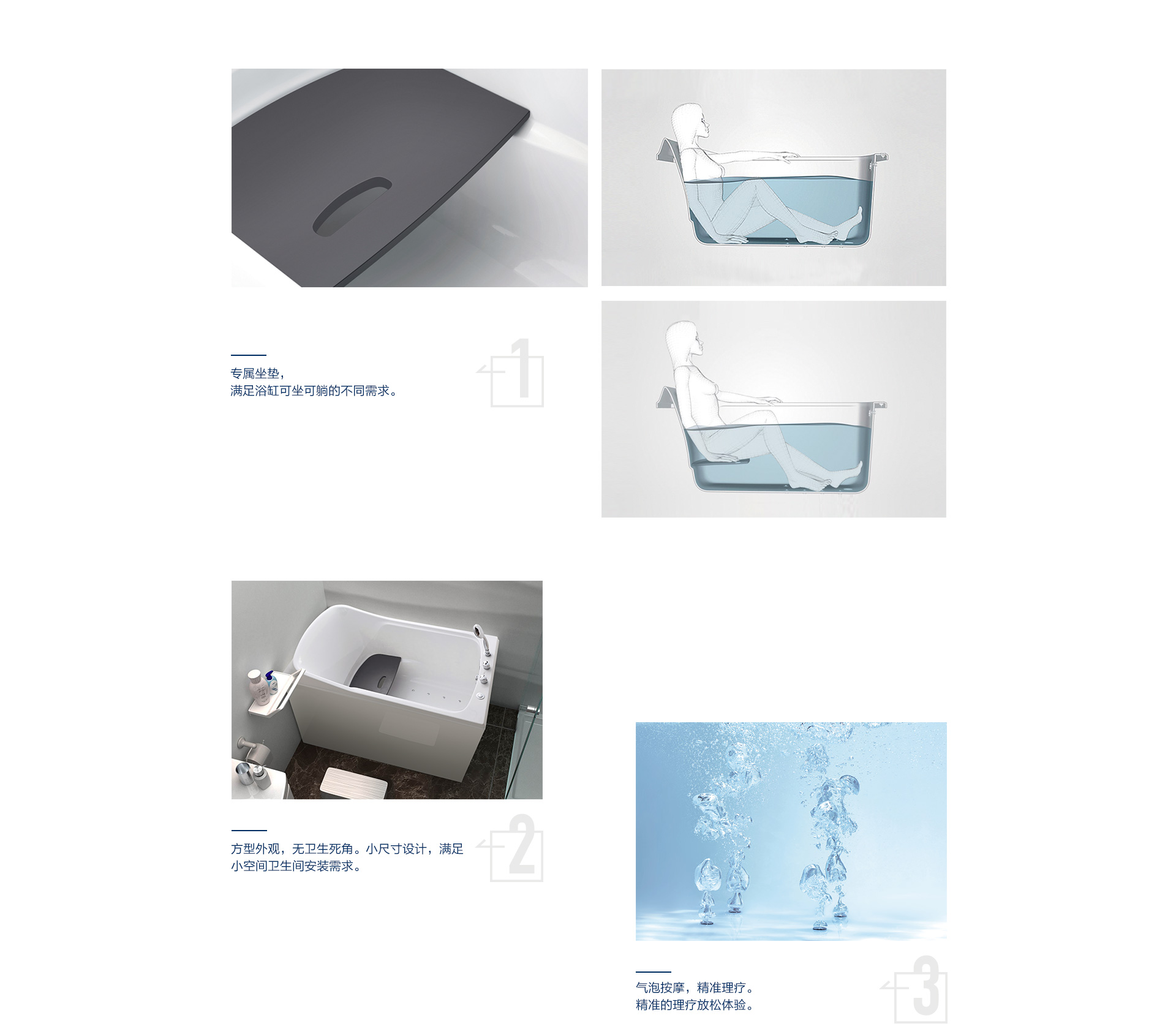 水療獨立按摩系統、勁速沖浪按摩系統、微泡泡按摩系統及汽泡按摩系統四件模式供你選擇,讓你隨心所浴,樂享水悅生活