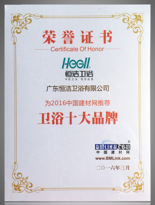 3月24日,“破局——2016中國建材行業高峰論壇”在國家會展中心(上海)舉行,恒潔被中國建材網推薦為2016年度“衛浴十大品牌”。4月9日,由中國室內裝飾協會裝飾材料用品專業委員會主辦的2016中國家居建材產業高峰論壇在北京舉行,恒潔再獲2016年度“衛浴十大品牌”殊榮。
